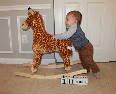 Brannock can now stand very very briefly on his own. He usually falls as soon as he comes to the realization that he is doing it. We have tempted him to take a couple steps but so far he doesn't have any interest. He spends a lot of time standing up on us and hanging onto our legs. He even likes to walk around this way. But his absolute favorite thing to do right now is walk around the house pushing his walker toy. (Really he will walk and push anything. Boxes, rocking chairs, high chairs, you name it!). If it will move he is more than happy to push it around the house. He is working on his coordination/balance and loves cruising.